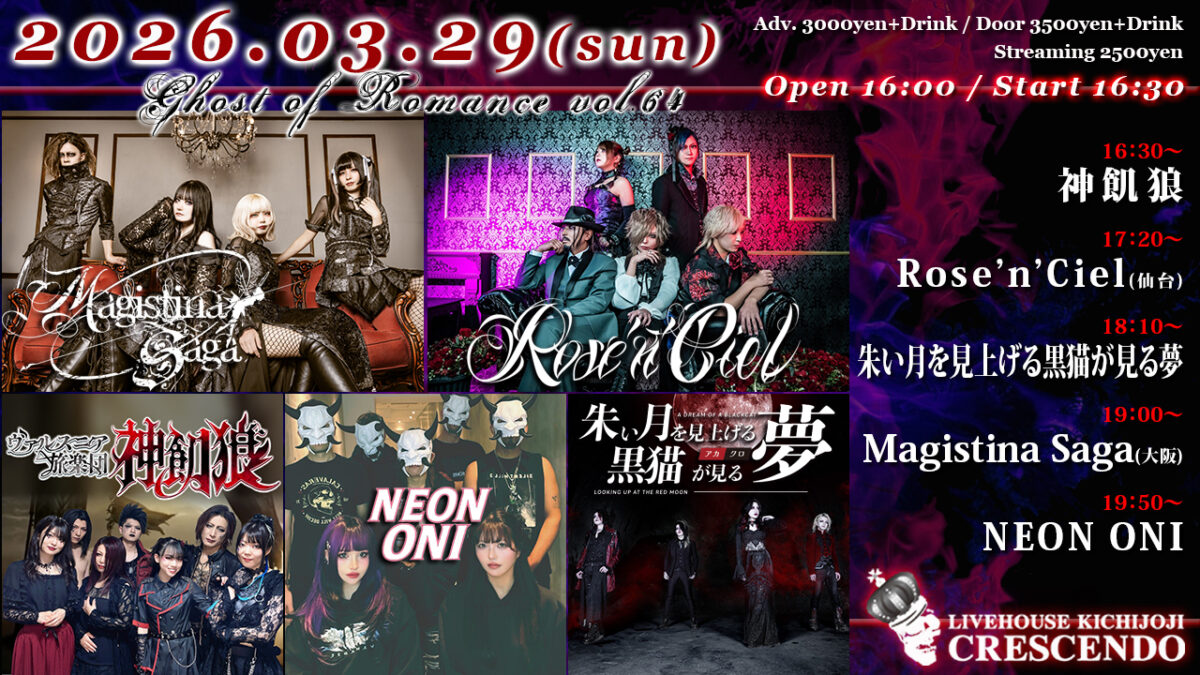 出演:NEON ONI / Magistina Saga (大阪) / 朱い月を見上げる黒猫が見る夢 / Rose’n’Ciel (仙台) / 神飢狼